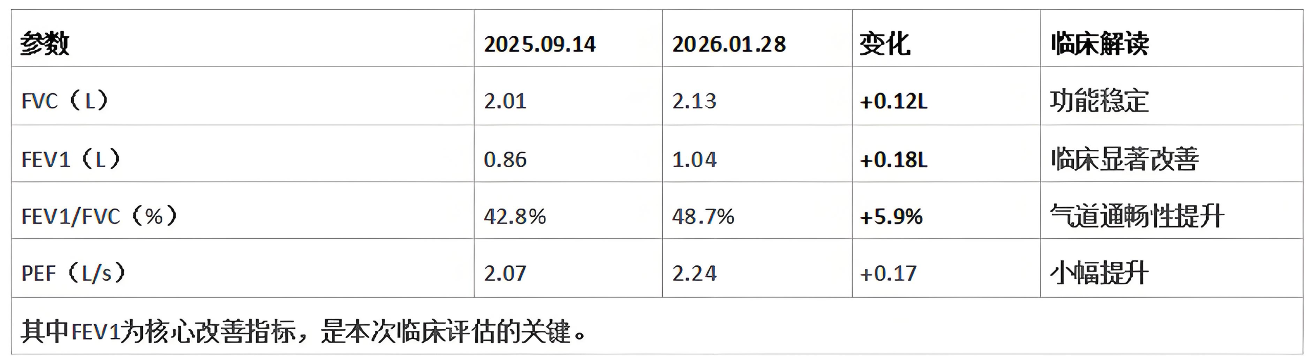 第二疗程后:2026 年 1 月(输注后 2 个月,患者 78 岁),肺功能指标持续向好,FVC 升至 2.13L,FEV1 大幅升至 1.04L,两个月内 FEV1 增加 180mL,而在慢阻肺临床研究中,FEV1 增加≥100mL 即被认为具有临床显著意义,该患者的改善幅度远超这一阈值。同时,气道通畅性指标 FEV1/FVC 从 42.8% 升至 48.7%,呼气峰流速(PEF)从 2.07L/s 升至 2.24L/s,肺部通气功能得到实质性改善