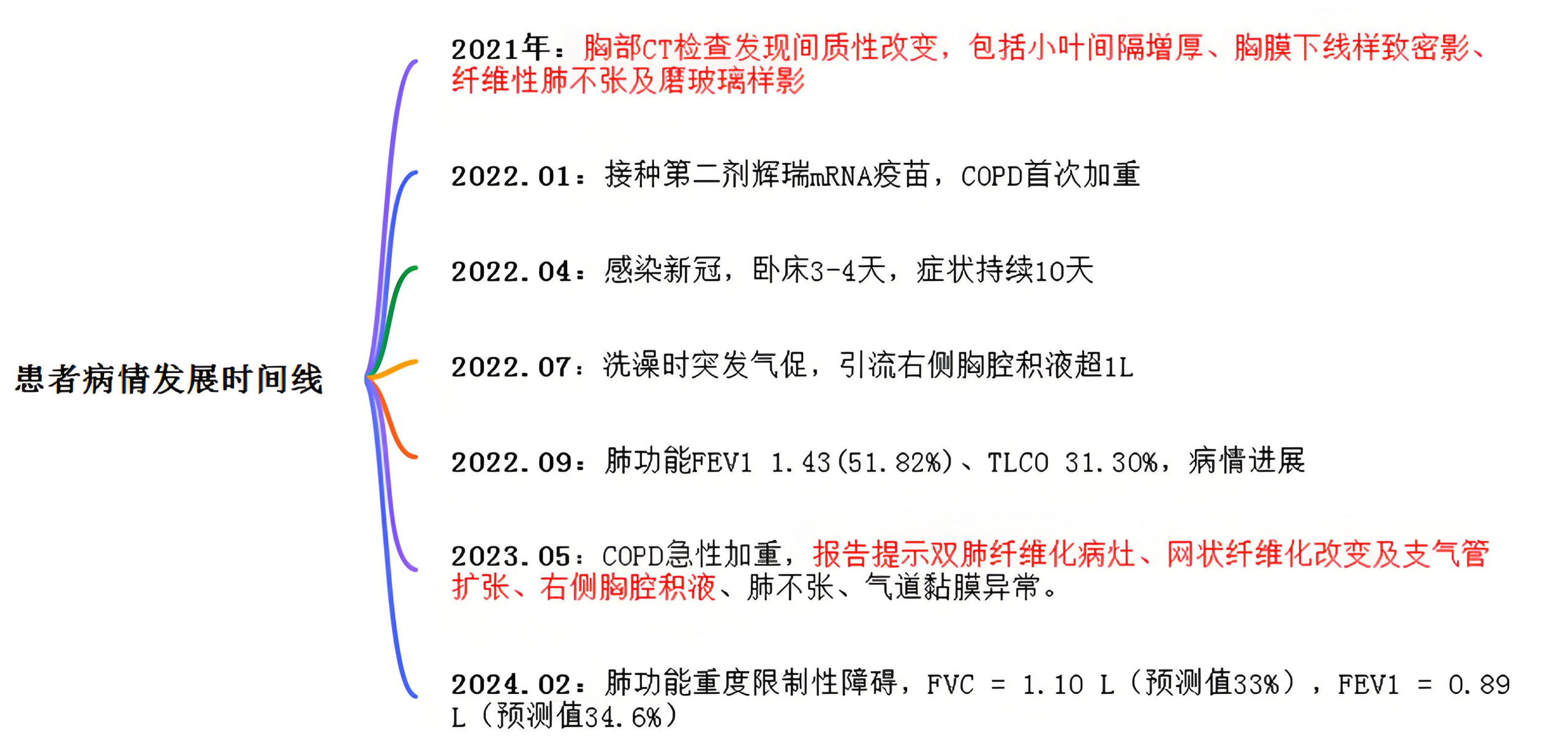 一名 74 岁男性患者,有50年吸烟史,合并缺血性心脏病(右冠状动脉支架植入),且身体存在特殊的遗传学特征--对C反应蛋白(CRP)水平升高高度易感,这意味着他天生炎症反应更强,也让肺部疾病的进展速度更快。患者病程发展如下(图1):