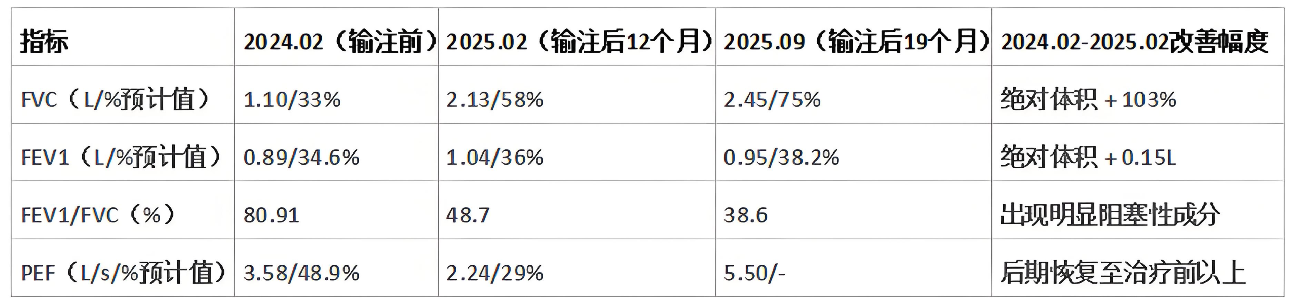 第一疗程后:治疗 12 个月,FVC 升至 2.13L,FEV1 升至 1.04L,FEV1 较治疗前增加 150mL;治疗 19 个月,FVC 进一步升至 2.45L,较治疗前基线提升超 2 倍,即使 FEV1 略有波动,也始终保持在治疗前之上,实现了肺容量的大幅提升。